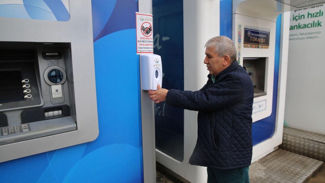 Altınordu Belediyesi Koronavirüs (COVİD-19) salgınına karşı alınan tedbirler kapsamında şehirde bulunan banka ATM'lerine ve toplu yaşam alanlarına dezenfektan yerleştirdi.