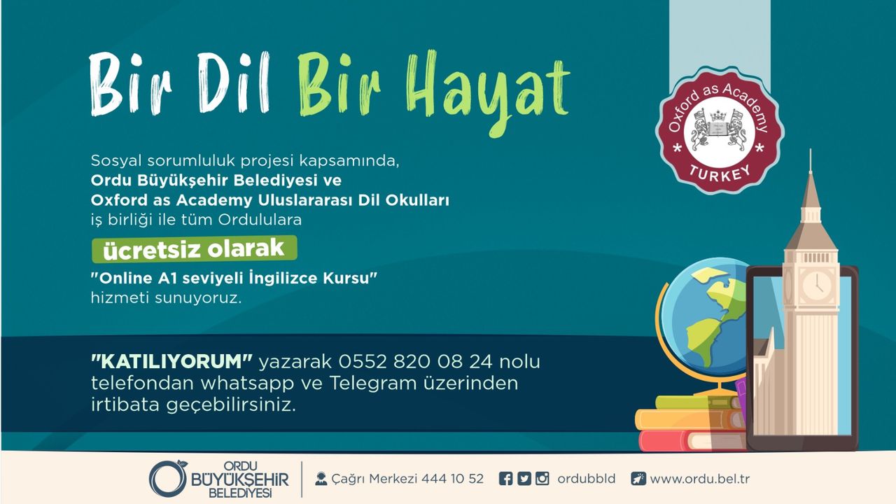 Ordu Büyükşehir Belediyesi’nin, Oxford as Academy Uluslararası Dil Okulları İşbirliği ile ücretsiz olarak başlattığı ve yoğun ilgi gören ‘Online A1 seviyeli İngilizce kursunun ikincisi düzenleniyor. Başvurular, 0552 820 08 24 nolu telefondan whatsapp ve telegram üzerinden ‘KATILIYORUM’ yazarak yapılabilecek.