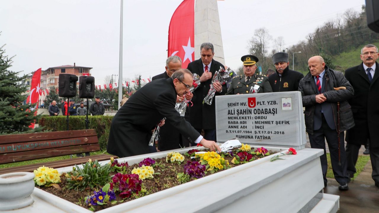 Vali Seddar Yavuz, Ordu Büyükşehir Belediye Başkanı Dr. Mehmet Hilmi Güler, Ordu Cumhuriyet Başsavcısı Mehmet Akif Aktaş, Ordu Askerlik Şubesi Başkanı ve Garnizon Komutanı Yarbay Ahmet Meydan, Türkiye Muharip Gaziler Derneği Başkanı Mehmet Ali Gümüşkaya, Türkiye Harp Malulü Gaziler Şehit Dul ve Yetimleri Derneği Başkanı Hasan Kaplan, Polis Şehitleri ve Malul Gazileri Yardımlaşma Derneği Başkanı Şenel Şahin’in yer aldığı törende, Vali Seddar Yavuz, şehit ve gazi aileleri dernekleri başkanları tarafından şehitlik anıtına çelenk koyuldu.