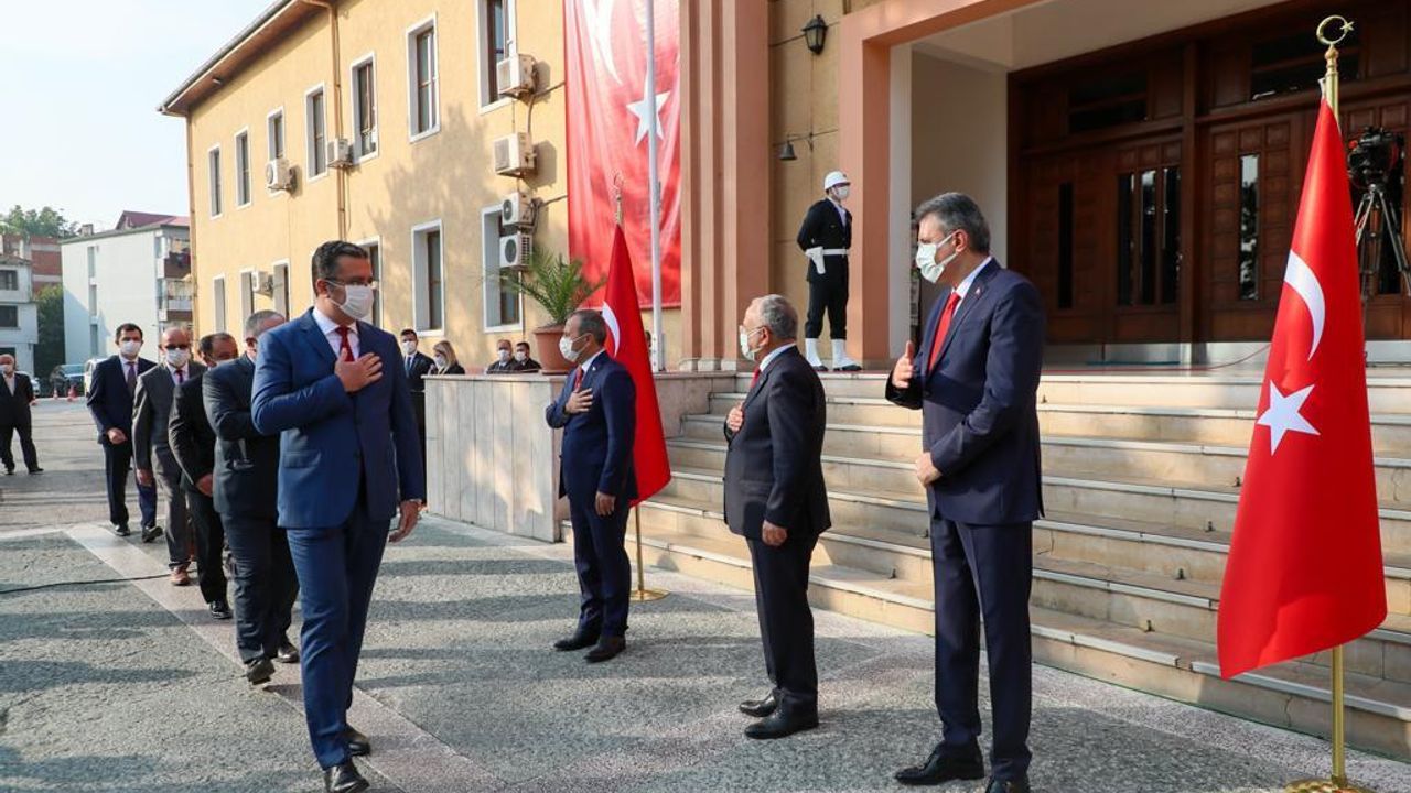Pandemi dolayısıyla Valilik Binası önünde gerçekleştirilen Tebrikat Töreni saygı duruşu ve İstiklal Marşının okunmasıyla başladı.