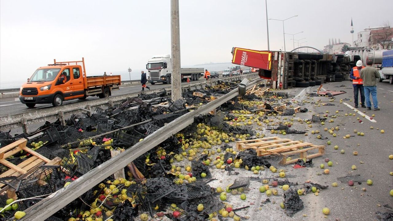 Tırın devrilmesi sonucu yola savrulan meyve kasaları ve elmalar nedeniyle trafik bir süre tek şeritten kontrollü sağlandı.