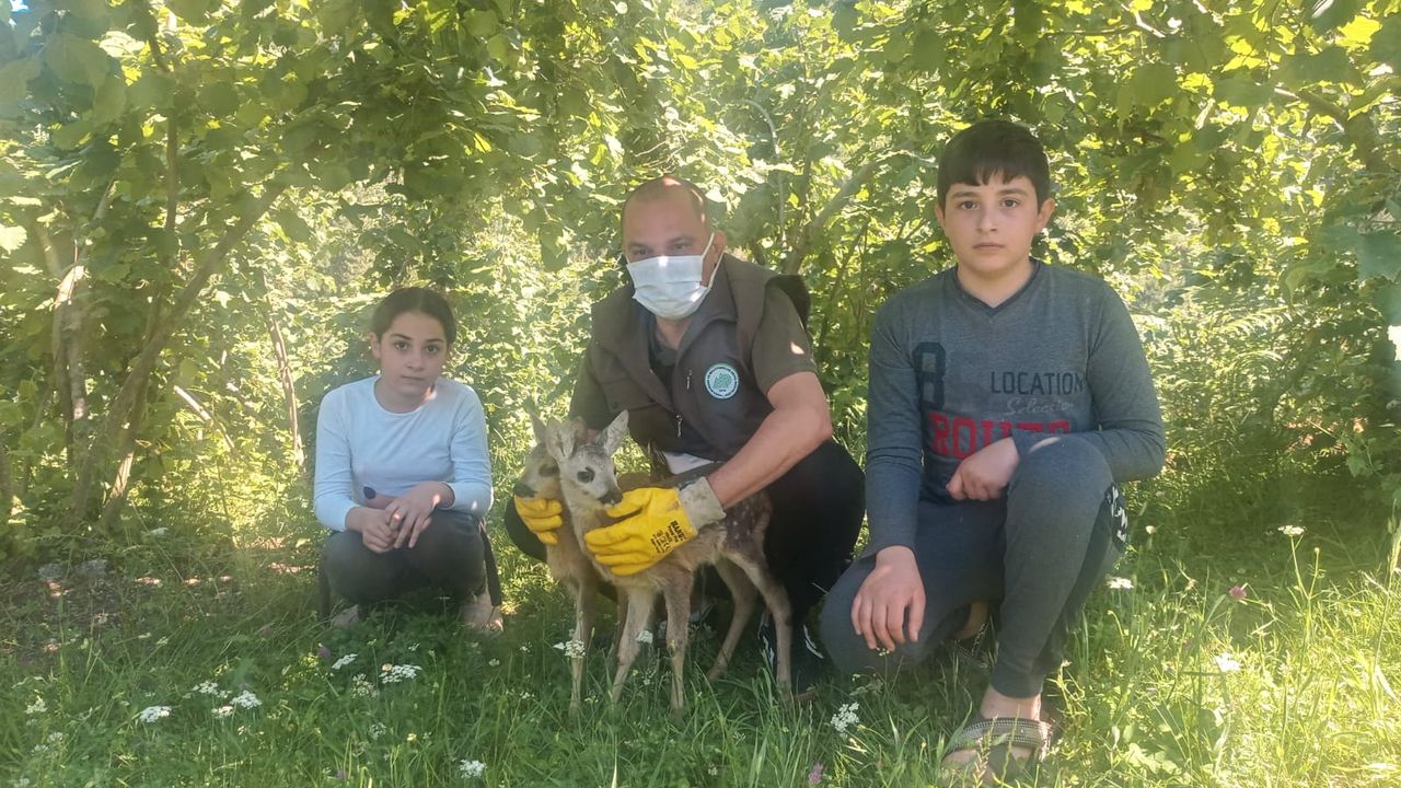 Ordunun Ünye ilçesinde Yağmur ve Efe Aydın Kardeşlerin fındık bahçelerinde dolaşırken buldukları karaca yavruları tekrar annelerine kavuşturuldu.