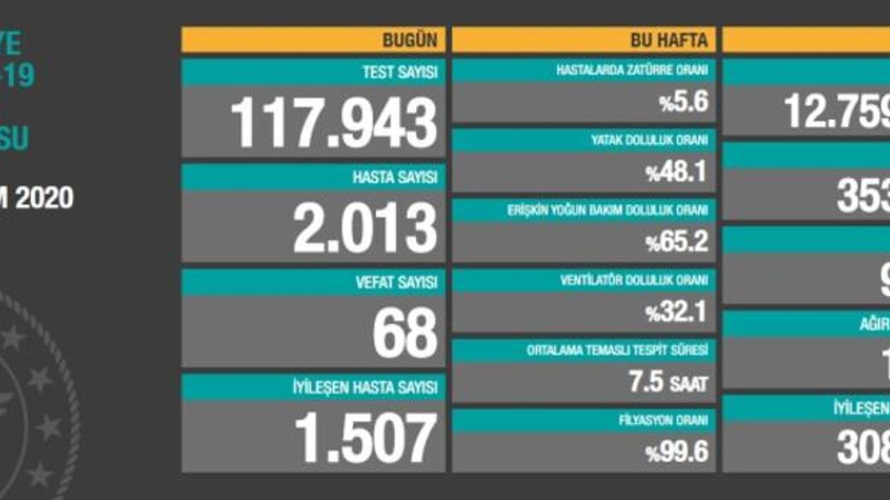 Sağlık Bakanlığı Corona virüsü (koronavirüs) için son gelişmeleri ve Türkiye Günlük Korona Tablosu'nu açıkladı. Türkiye'de son 24 saatte 117 bin 943 Kovid-19 testi yapıldı, 2013 kişiye hastalık tanısı konuldu, 68 kişi hayatını kaybetti. Ağır hasta sayısı 1504 oldu, son 24 saatte 1507 kişinin Kovid-19 tedavisinin tamamlanmasıyla iyileşenlerin sayısı 308 bin 446'ya yükseldi.