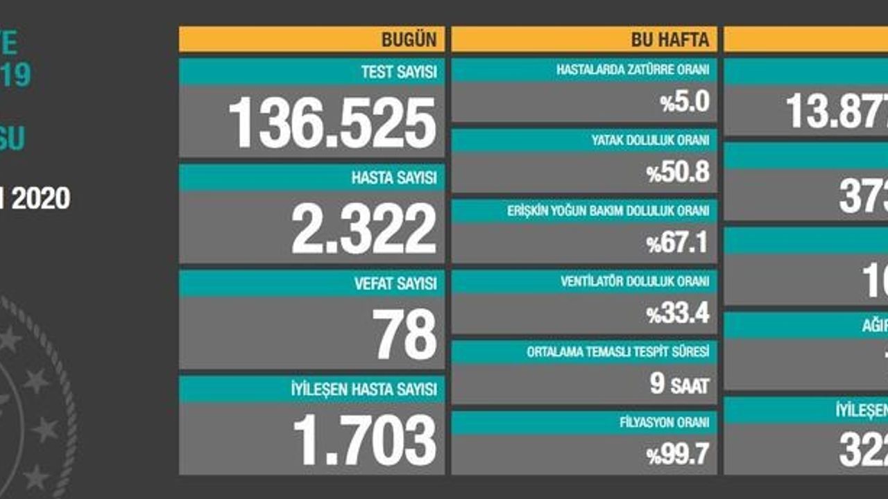 Türkiye'de son 24 saatte 136 bin 525 yeni tip koronavirüs (Kovid-19) testi yapıldı, 2 bin 322 kişiye hastalık tanısı konuldu, 78 kişi yaşamını yitirdi.