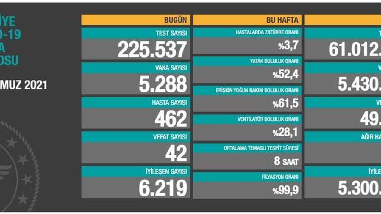 'Türkiye Covid- 19 Hasta Tablosu'na göre; son 24 saatte yapılan 225 bin 537 testte 5 bin 288 vaka, 462 hasta tespit edildi. Virüs nedeniyle 42 kişi hayatını kaybederken, 6 bin 219 kişinin de tedavisi ve karantinası sona erdi.