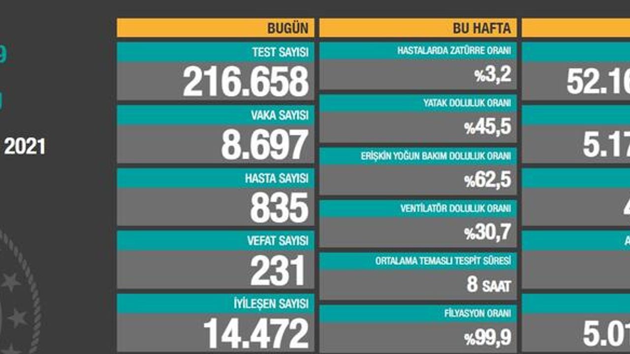 Türkiye'de son 24 saatte 216 bin 658 Kovid-19 testi yapıldı, 8 bin 697 kişinin testi pozitif çıktı, 231 kişi hayatını kaybetti.