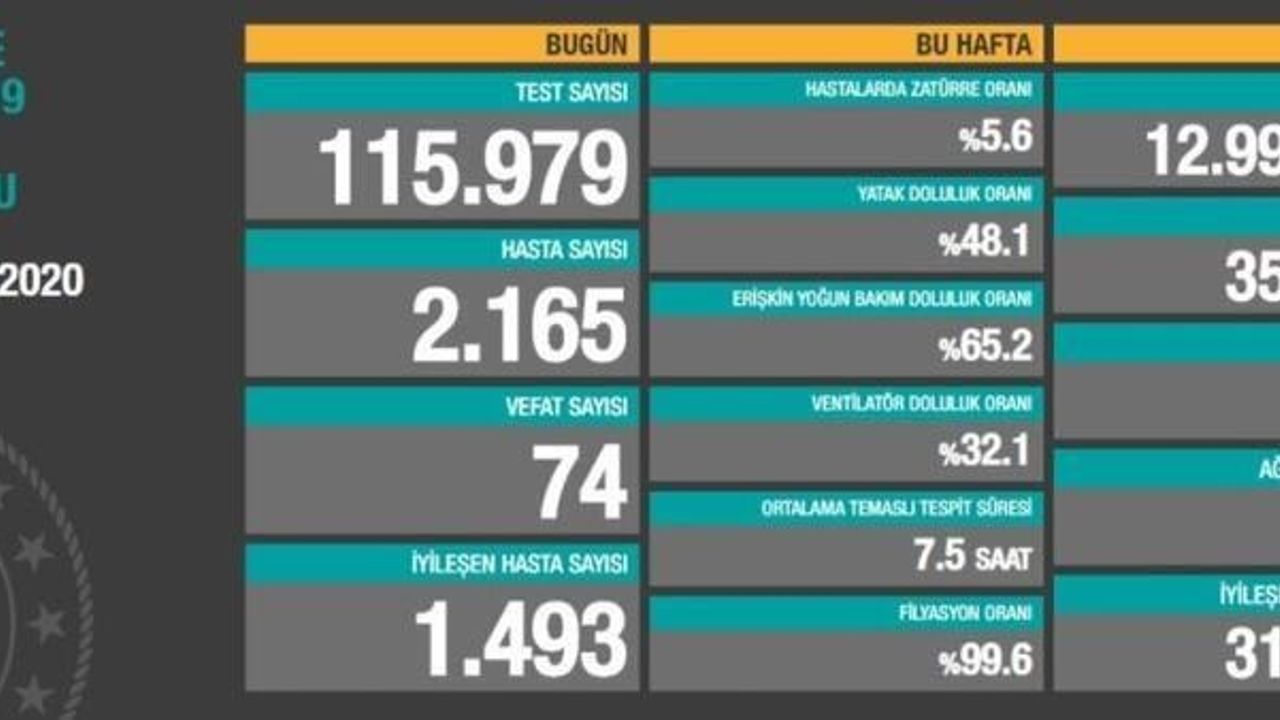 Türkiye Günlük Koronavirüs Tablosu, “covid19.saglik.gov.tr” adresinden paylaşıldı. Türkiye’de son 24 saatte 115 bin 979 Kovid-19 testi yapıldı, 2.165 kişiye hastalık tanısı konuldu, 74 kişi hayatını kaybetti.