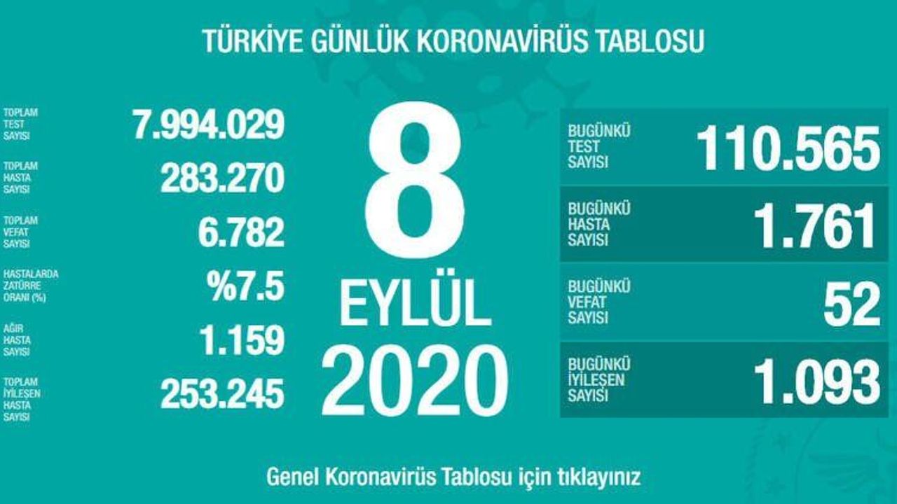 Sağlık Bakanlığı, 8 Eylül Türkiye Günlük Korona Tablosu'nu paylaştı. Tabloya göre, son 24 saatte 110 bin 565 Kovid-19 testi yapıldı, 1761 kişiye hastalık tanısı konuldu, 52 kişi Kovid-19 nedeniyle hayatını kaybetti, ağır hasta sayısı 1159 oldu.