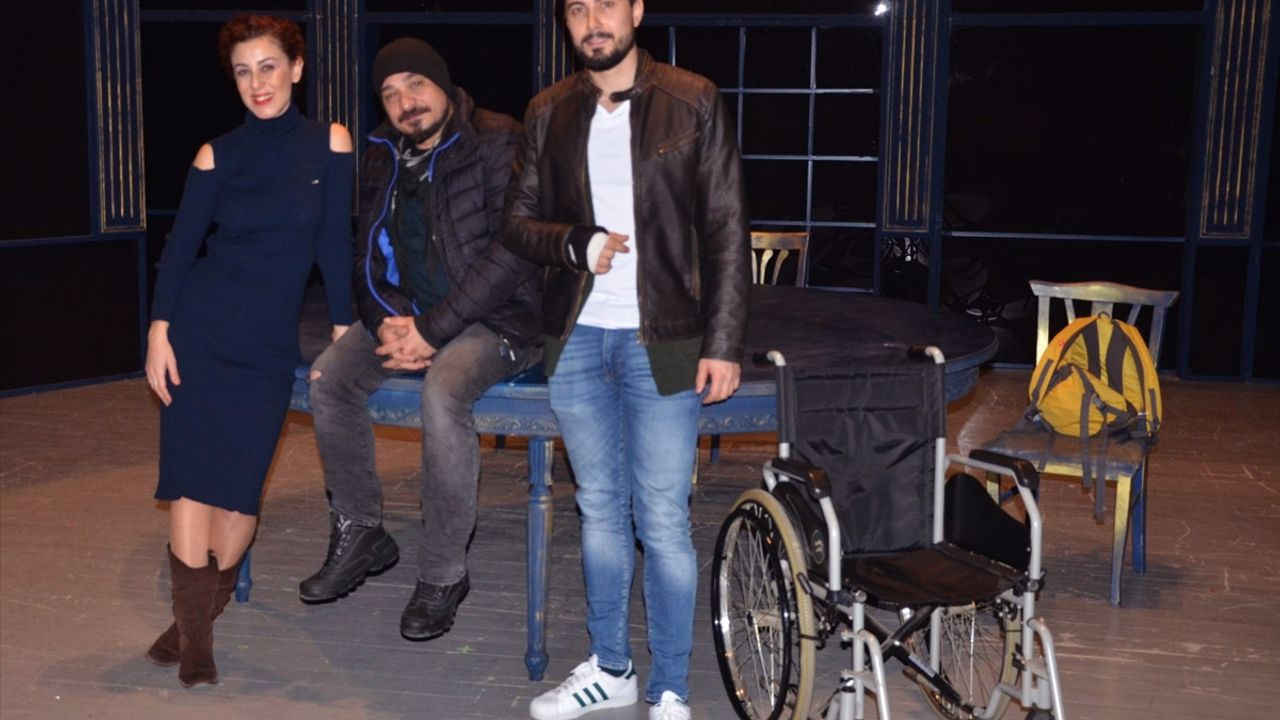 ORDU (AA) - Trabzon Devlet Tiyatrosunun 'Ben Ödüyorum' adlı oyununun sahnelenmesinden önce merdivenden düşen başrol oyuncusu tekerlekli sandalyeyle sahneye çıktı.