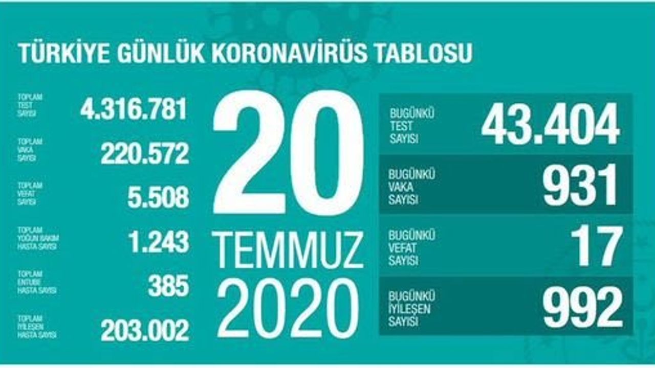 Bakan Koca'nın açıkladığı covid19.saglik.gov.tr'deki son koronavirüs tablosuna göre, bugün yapılan 43 bin 404 testten 931'i pozitif çıktı, 17 hasta da hayatını kaybetti. Toplam hasta sayısı 220 bin 572 oldu. Toplamda 5 bin 508 hasta koronavirüs nedeniyle hayatını kaybetti. Yoğun bakımdaki hasta sayısı 1243, entübe edilmiş hasta sayısı 385 oldu. 203 bin 2 hasta da iyileşti.