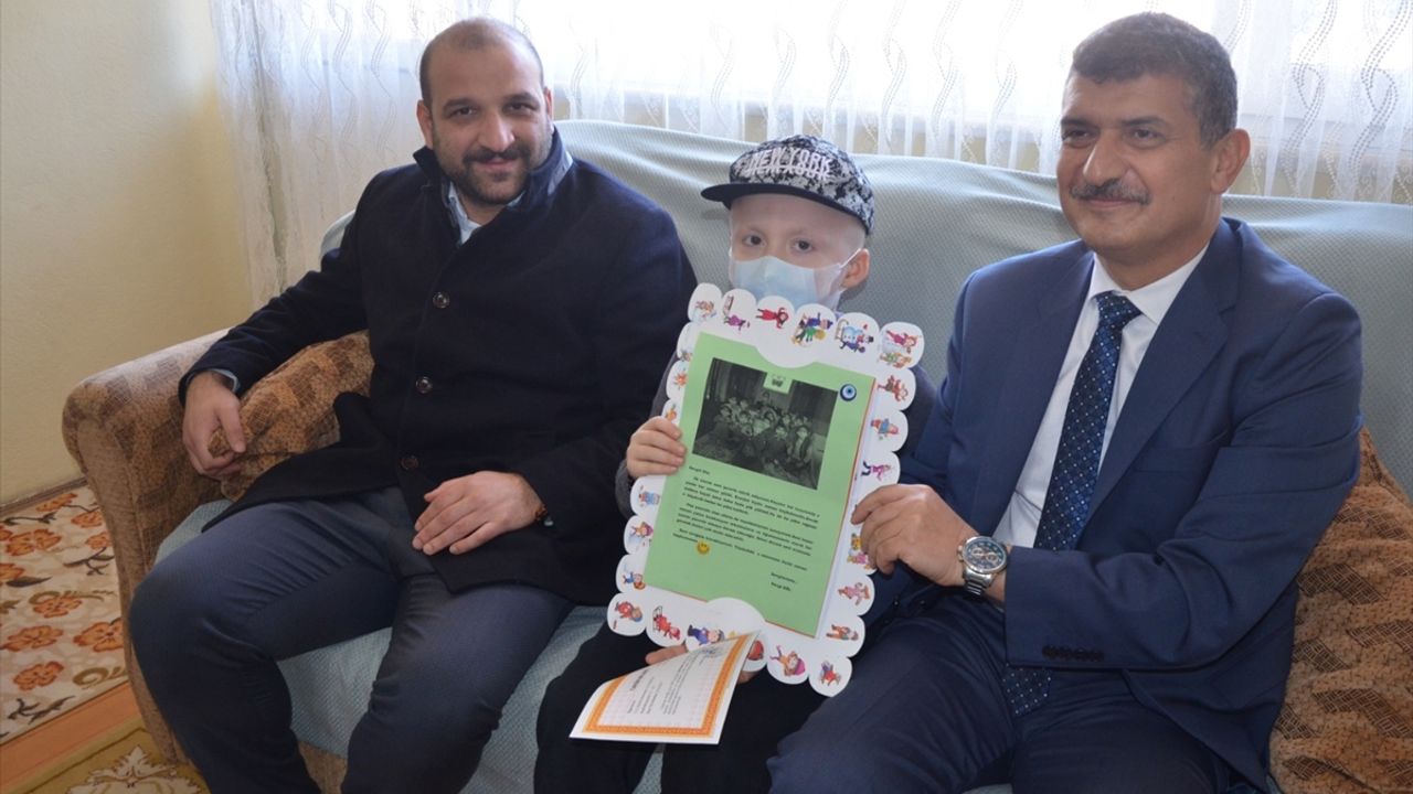 Kulak Çetirtepe İlkokulu'nda 1. sınıfa kayıtlı kanser tedavisi gören İbrahim Efe Ulasi ile engelli öğrenci Hilal Akarpınar, karnelerini evlerinde aldı.