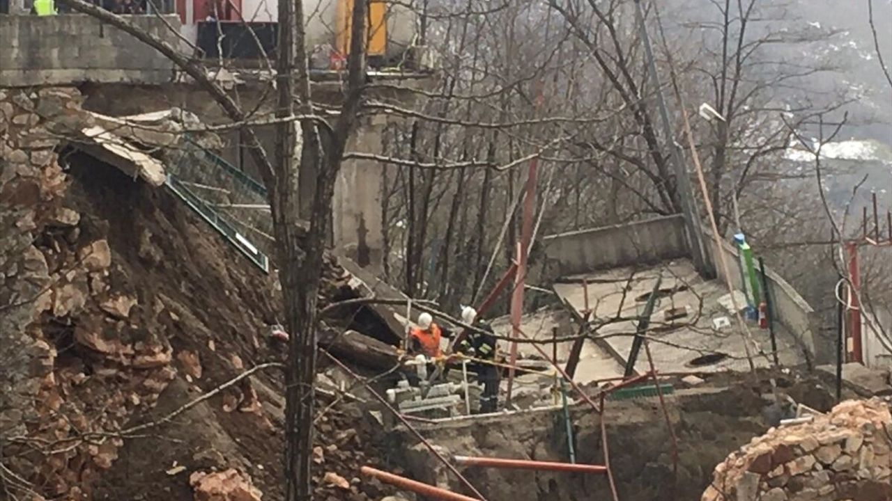 İlçe merkezi girişinde yol kenarında bulunan istasyonun alt kısmındaki duvarın dün çökmesi üzerine başlatılan çalışmalar bugün devam etti.