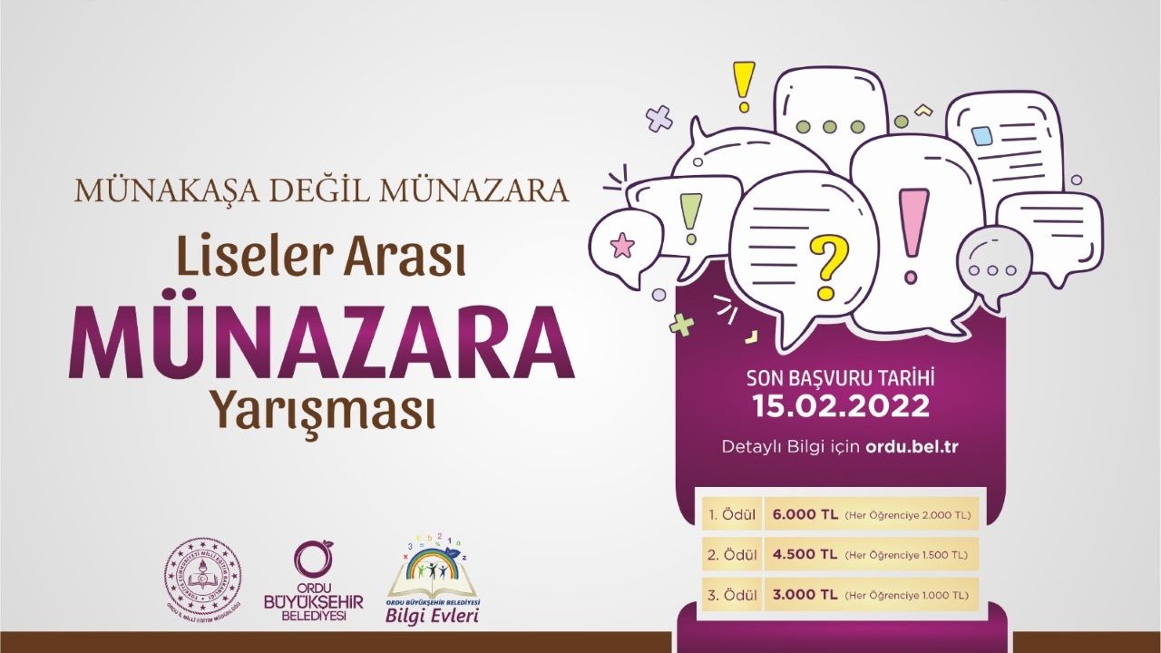Ordu Büyükşehir Belediyesi ve Ordu İl Milli Eğitim Müdürlüğü iş birliğinde “Münakaşa Değil Münazara” adıyla liseler arası ödüllü münazara yarışması düzenlenecek. 19 ilçede bulunan MEB’e bağlı tüm resmi ve özel liselerin katılacağı yarışma için son başvuru 15 Şubat’ta sona erecek.