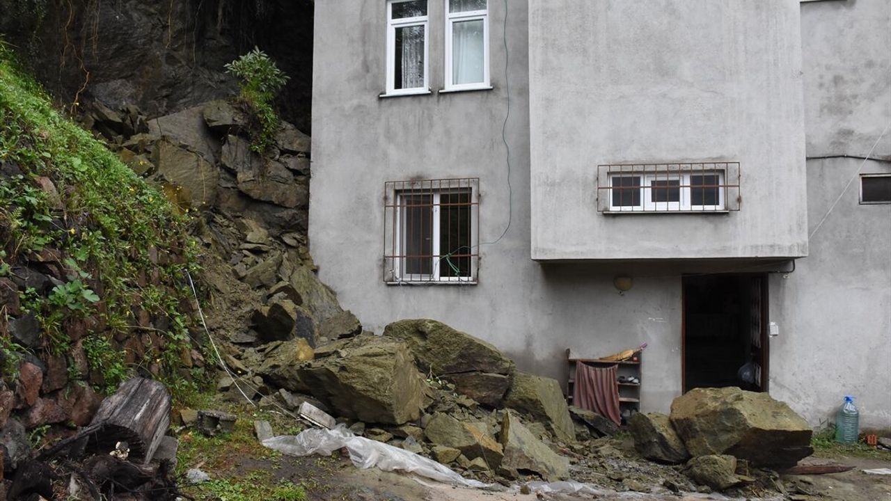 Yamaçtan düşen kaya parçaları, binanın zemin katındaki evin duvarının yıkılmasına neden oldu.