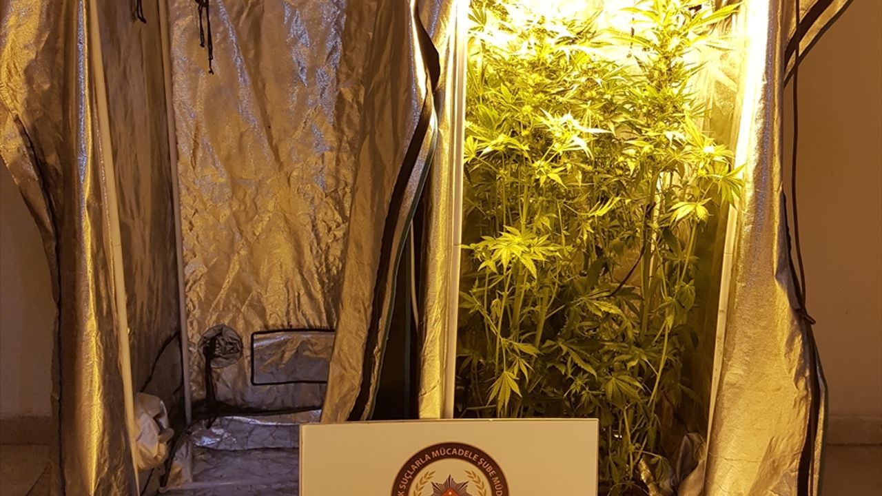 Evde yapılan aramada camları karartılmış balkonda havalandırma, ışık, sulama düzeneği bulunan ve ısı yalıtımlı iki kabinde 4 Hint keneviri bitkisi, 450 gram esrar, ruhsatsız tabanca ve 100 fişek ele geçirildi.