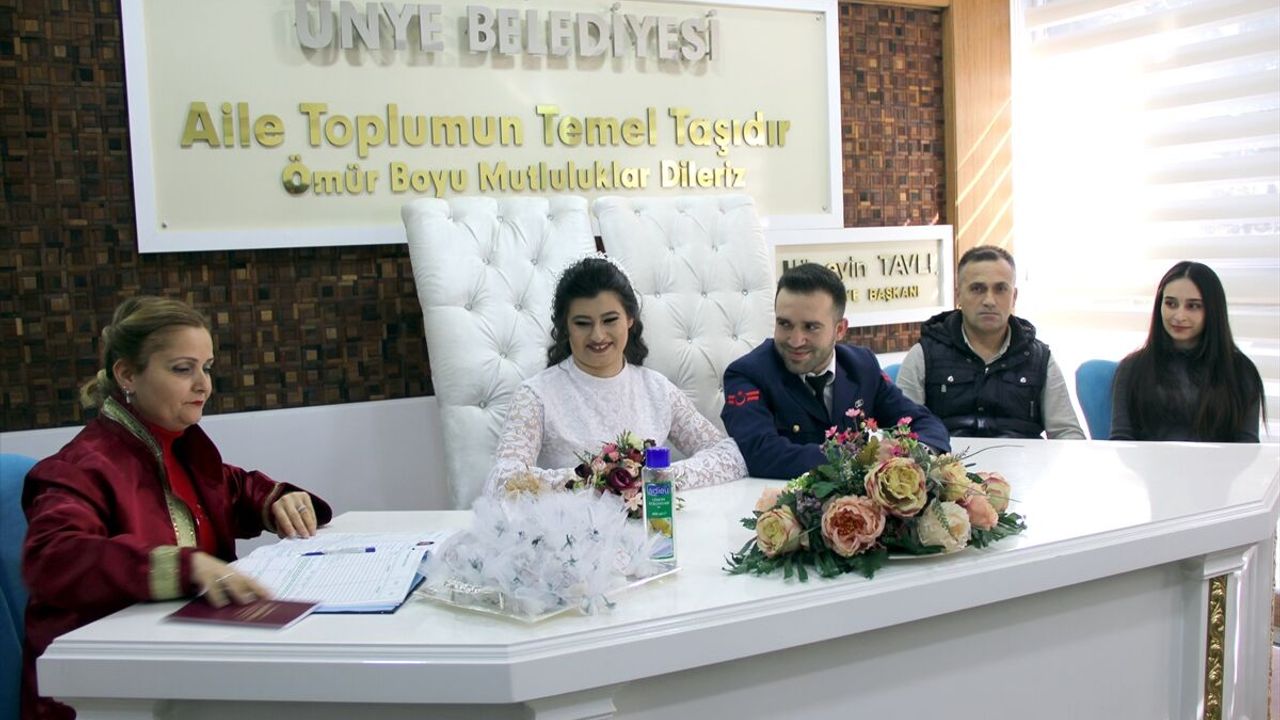 Ordu'nun Ünye ilçesinde evlenmek için 14 Şubat Sevgililer Günü'nü seçen uzman çavuş, nikahına üniformasıyla geldi.