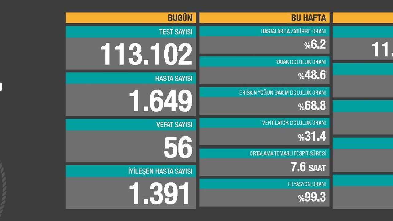 Sağlık Bakanlığı, 10 Ekim Türkiye Günlük Korona Tablosu'nu paylaştı. Tabloya göre, son 24 saatte 56 kişi Kovid-19 nedeniyle hayatını kaybetti, ağır hasta sayısı 1414 oldu. Son 24 saatte 1391 kişinin Kovid-19 tedavisinin tamamlanmasıyla iyileşenlerin sayısı 293 bin 145'e yükseldi.
