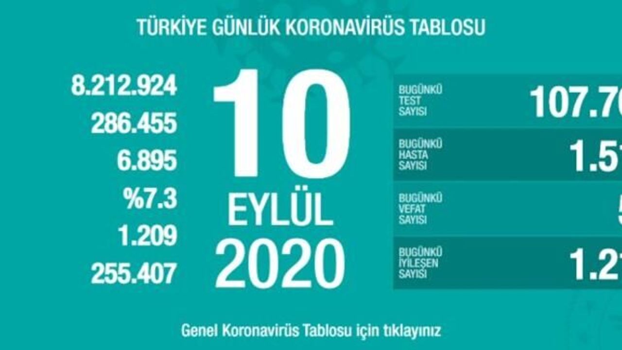 Sağlık Bakanlığı Corona virüsü (koronavirüs) için son gelişmeleri ve Türkiye Günlük Korona Tablosu'nu açıkladı. Türkiye'de son 24 saatte 107 bin 702 Kovid-19 testi yapıldı, 1512 kişiye hastalık tanısı konuldu. Son 24 saatte 58 kişi Kovid-19 nedeniyle hayatını kaybetti, ağır hasta sayısı 1209 oldu.
