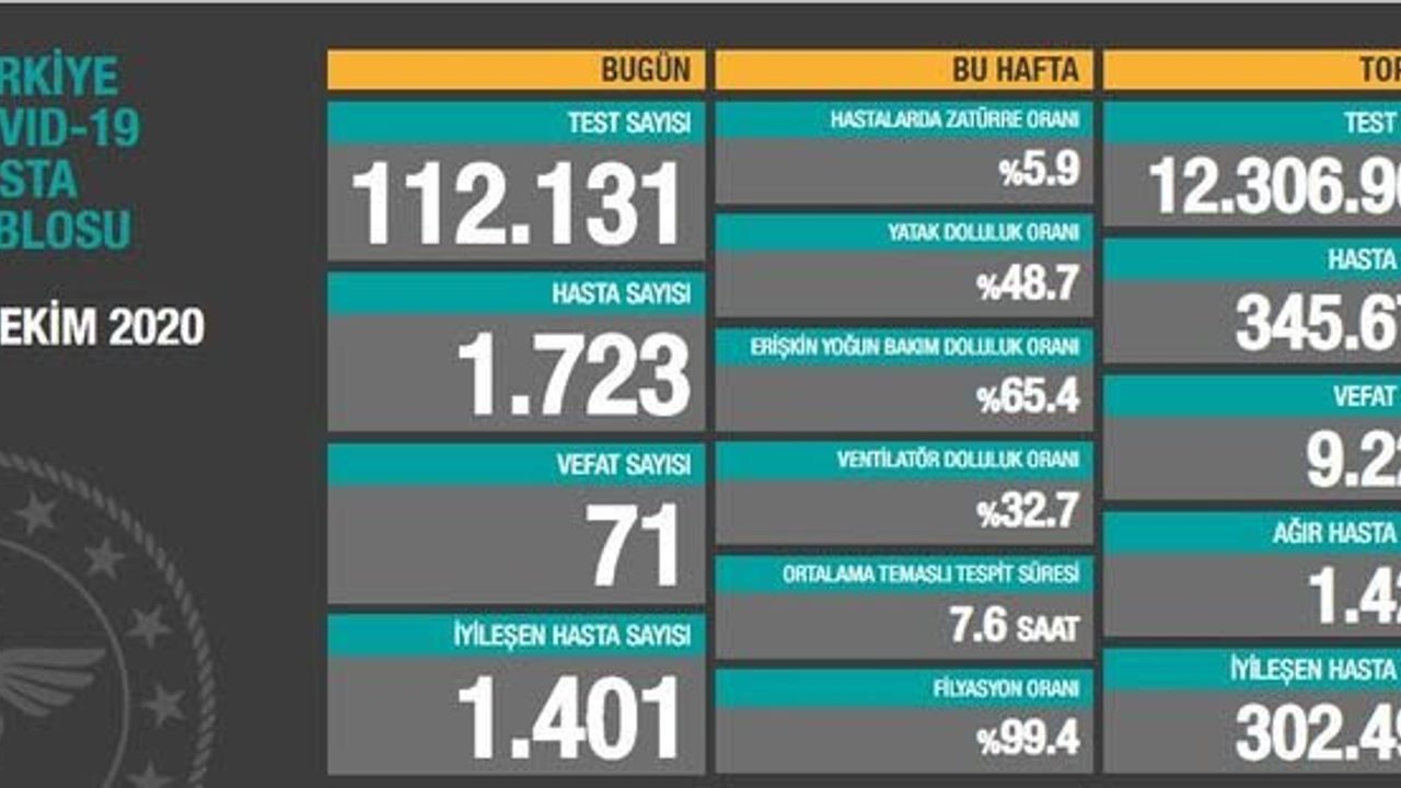 Sağlık Bakanlığı, 17 Ekim Türkiye Günlük Korona Tablosu'nu paylaştı. Tabloya göre, Türkiye'de son 24 saatte 112 bin 131 Kovid-19 testi yapıldı, 1723 kişiye hastalık tanısı konuldu, 71 kişi hayatını kaybetti, Ağır hasta sayısı 1428 oldu, son 24 saatte 1401 kişinin Kovid-19 tedavisinin tamamlanmasıyla iyileşenlerin sayısı 302 bin 499'a yükseldi.