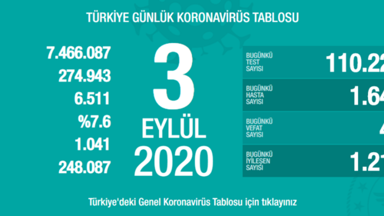 Sağlık Bakanlığı Corona virüsü (koronavirüs) için son gelişmeleri ve Türkiye Günlük Korona Tablosu'nu açıkladı. Tabloya göre, son 24 saatte 49 kişi hayatını kaybetti, 110 bin 225 Kovid-19 testi yapıldı, 1642 kişiye hastalık tanısı konuldu.