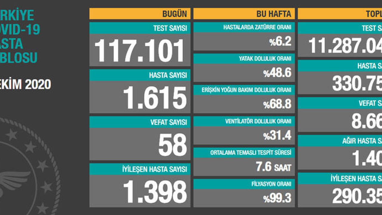 Sağlık Bakanlığı Corona virüsü (koronavirüs) için son gelişmeleri ve Türkiye Günlük Korona Tablosu'nu açıkladı. Tabloya göre, son 24 saatte 117 bin 101 Kovid-19 testi yapıldı, 1615 kişiye hastalık tanısı konuldu, 58 kişi Kovid-19 nedeniyle hayatını kaybetti, 1403 ağır hasta sayısı oldu.