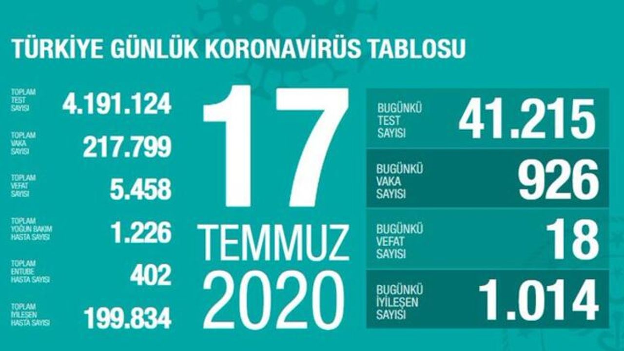 Tabloya göre, son 24 saatte 926 kişiye Kovid-19 tanısı konuldu, 18 kişi hayatını kaybetti, toplam vaka sayısı 217 bin 799, can kaybı 5 bin 458 oldu.