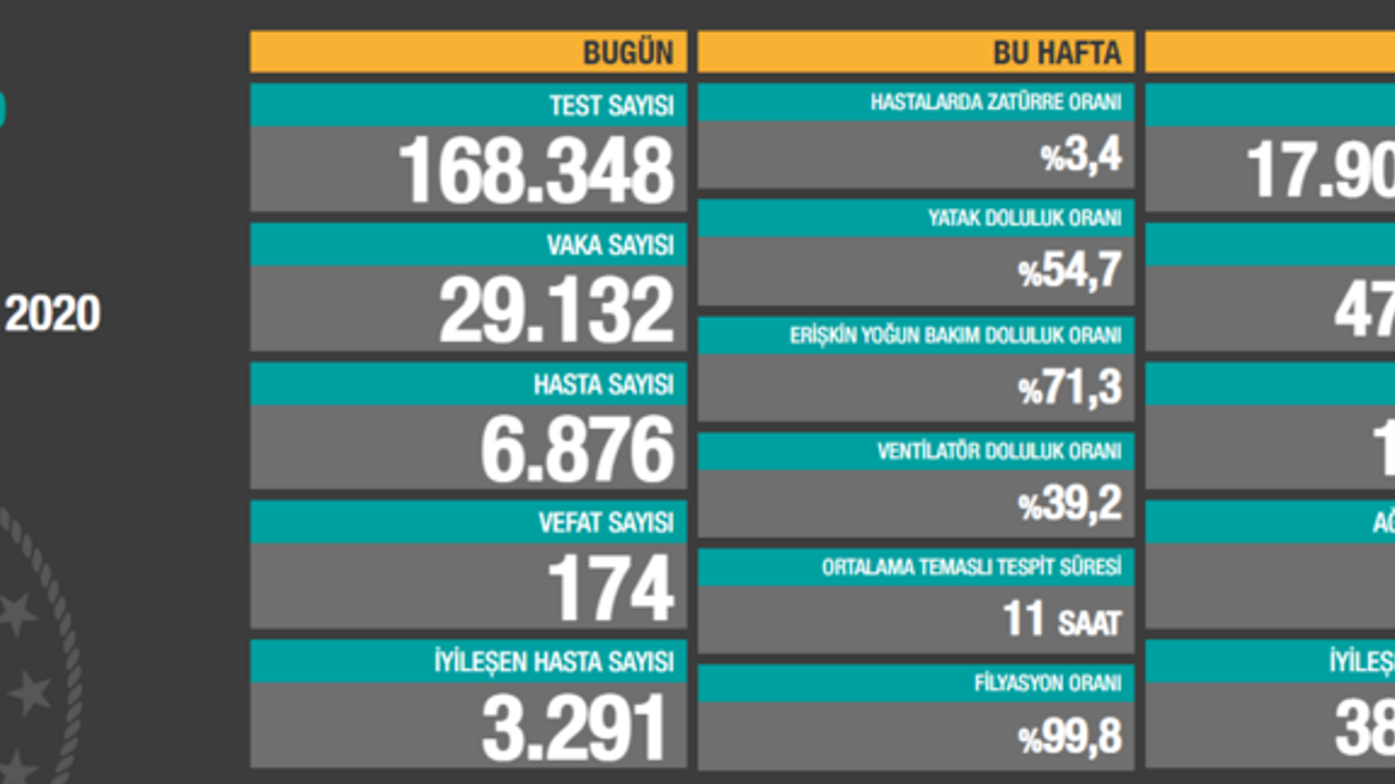 Güncel verilere göre, son 24 saatte 168 bin 348 Kovid-19 testi yapıldı, 6.876 kişiye hastalık tanısı konuldu. Son 24 saatte 174 kişi hayatını kaybetti, 3.291 kişinin Kovid-19 tedavisinin tamamlanmasıyla iyileşenlerin sayısı 388 bin 771'ye yükseldi. Bugün 29.132 kişiye Kovid-19 tanısı konuldu.