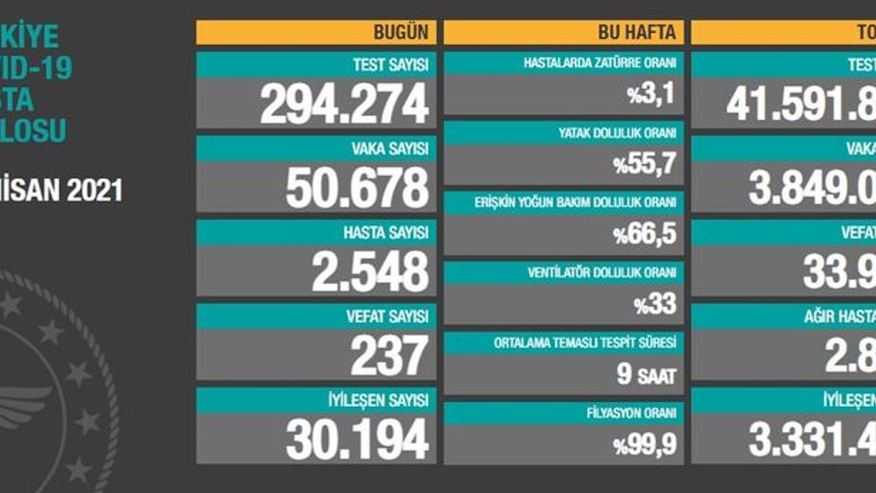 Türkiye'de son 24 saatte 294 bin 274 Kovid-19 testi yapıldı, 50 bin 678 kişinin testi pozitif çıktı, 237 kişi hayatını kaybetti.