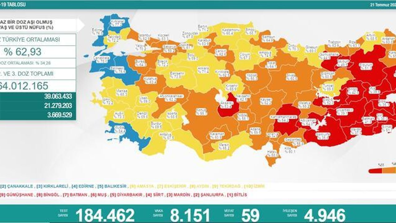 Türkiye'de son 24 saatte 184 bin 462 test yapılırken 8 bin 151 vaka belirlendi. Maalesef koronavirüsten 59 vatandaşımız hayatını kaybetti.