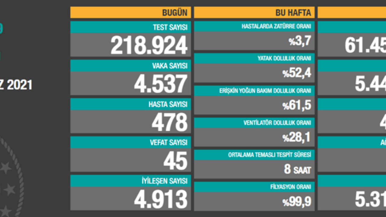 Türkiye'de son 24 saatte 218 bin 924 Kovid-19 testi yapıldı, 4 bin 537 kişinin testi pozitif çıktı, 45 kişi hayatını kaybetti.