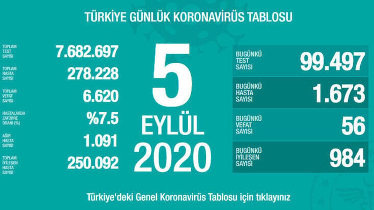 Sağlık Bakanlığı'nın açıkladığı tabloya göre, bugün yapılan 99 bin 497 koronavirüs testinden 1673'ü pozitif çıktı. Bugün 56 hasta koronavirüs nedeniyle hayatını kaybetti. Toplam hasta sayısı 278 bin 228 olurken toplam hayatını kaybeden hastaların sayısı da 6 bin 620 oldu. Ağır hasta sayısı da 1091 oldu. Toplam 250 bin 92 hasta da koronavirüsü yenerek hayata tutundu.