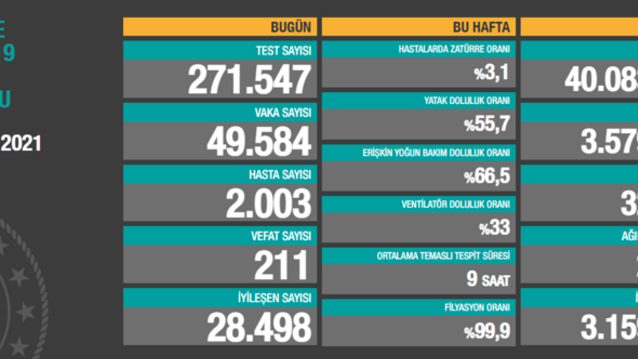 Türkiye'de son 24 saatte 271 bin 547 Kovid-19 testi yapıldı, 49 bin 584 kişinin testi pozitif çıktı, 211 kişi hayatını kaybetti. Ağır hasta 2 bin 477 oldu, 28 bin 498 kişinin Kovid-19 tedavisinin/karantinasının sona ermesiyle iyileşen sayısı 3 milyon 159 bin 475'e yükseldi.