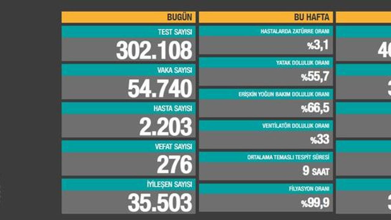 Türkiye'de son 24 saatte 302 bin 108 Kovid-19 testi yapıldı, 54 bin 740 kişinin testi pozitif çıktı, 276 kişi hayatını kaybetti. Ağır hasta 2 bin 604 oldu, 35 bin 503 kişinin Kovid-19 tedavisinin karantinasının sona ermesiyle iyileşen sayısı 3 milyon 194 bin 978'e yükseldi.
