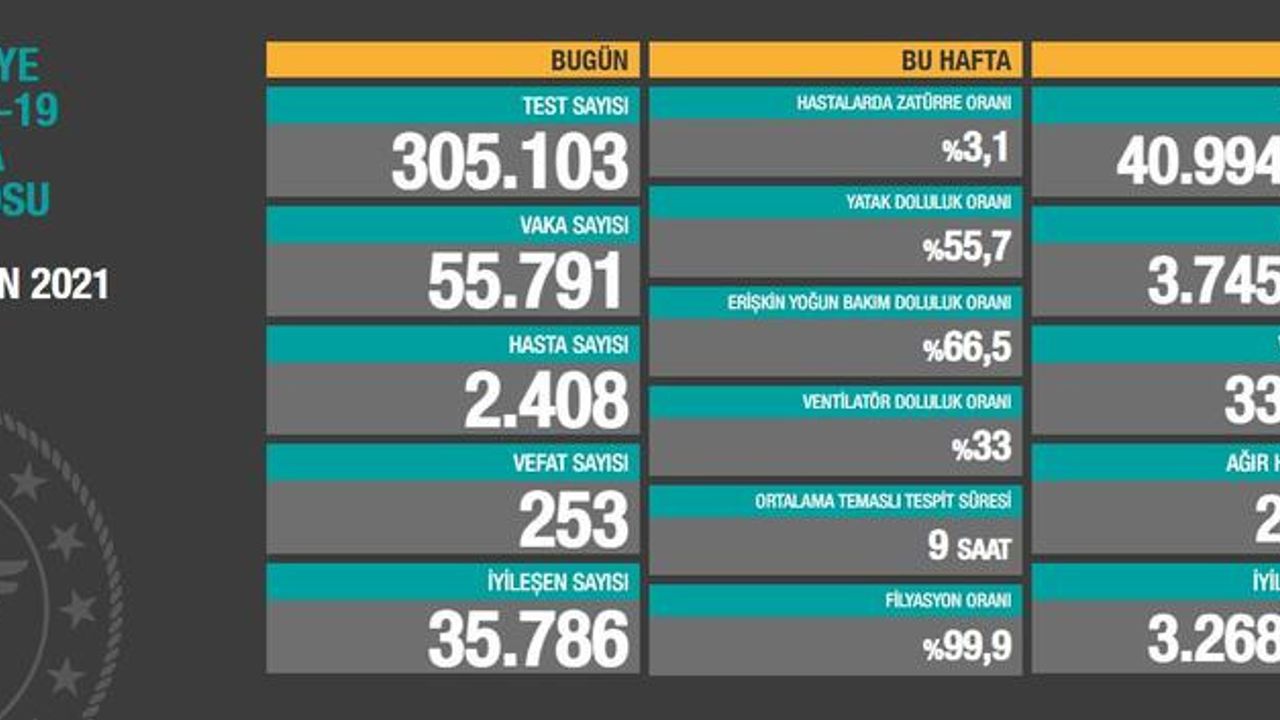 Türkiye'de son 24 saatte 305 bin 103 Kovid-19 testi yapıldı, 55 bin 791 kişinin testi pozitif çıktı, 253 kişi hayatını kaybetti.