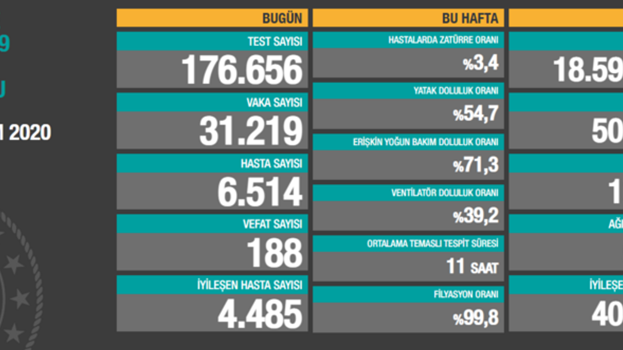 Türkiye Günlük Korona Tablosu'nu açıkladı. Tabloya göre, son 24 saatte 176.656 Kovid-19 testi yapıldı, 31.219 kişinin testi pozitif çıktı, 188 kişi hayatını kaybetti, ağır hasta sayısı 5.190 oldu, son 24 saatte 4.485 kişinin Kovid-19 tedavisinin tamamlanmasıyla iyileşenlerin sayısı 404.727'ye yükseldi.
