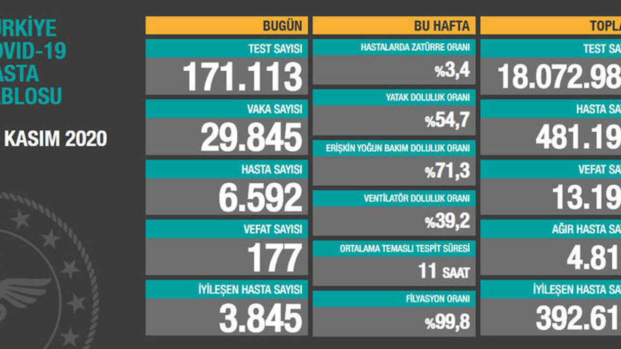 Sağlık Bakanlığı, 27 Kasım Türkiye Günlük Korona Tablosu'nu paylaştı. Tabloya göre, son 24 saatte 171 bin 113 Kovid-19 testi yapıldı, 29 bin 845 kişinin testi pozitif çıktı, 177 kişi hayatını kaybetti, ağır hasta sayısı 4 bin 816 oldu, son 24 saatte 3 bin 845 kişinin Kovid-19 tedavisinin tamamlanmasıyla iyileşenlerin sayısı 392 bin 616'ya yükseldi.