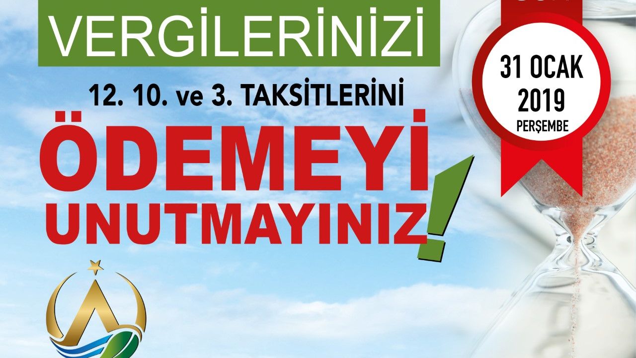 “Belediyemize olan emlak vergisi, reklam vergisi, çevre temizlik vergisi, kira ve ecrimisil ile diğer bazı vergi borçlarını 6736 sayılı Yasa’dan yararlanarak yapılandıran mükellefimizin 12. taksiti, 7020 sayılı Yasa’dan yararlanarak yapılandıran mükelleflerimizin 10. taksiti ve 7143 sayılı Yasa’dan yararlanarak borcunu yapılandıran mükelleflerimizin 3. taksitlerini ödeme süresi 31 Ocak Perşembe günü mesai bitiminde sona erecektir. Bu sebeple mükelleflerimizin mağdur olmamaları için taksitlerini ödemeleri gerekmektedir.